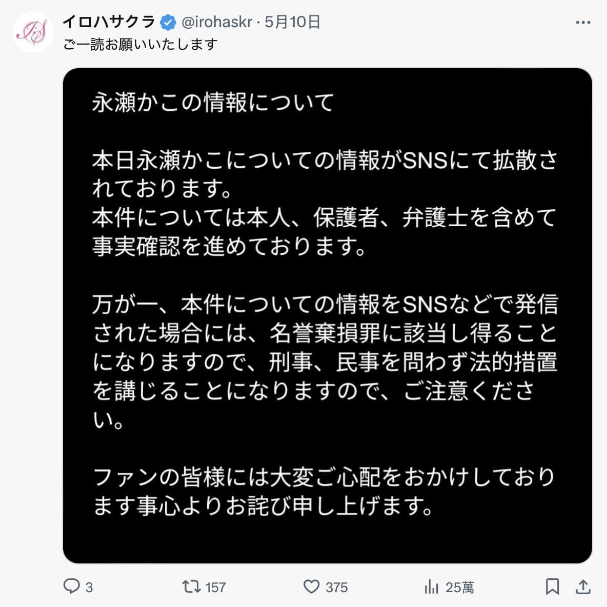我们已经注意到永瀬かこ(永濑加子)的情报在社群上快速扩散,目前正和本人及其监护人还有律师进行确认,请不要随便传播那个讯息,否则可能会构成诽谤罪,我们会针对刑事和民事的部分采取法律行动!