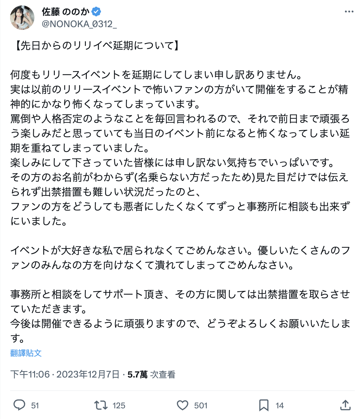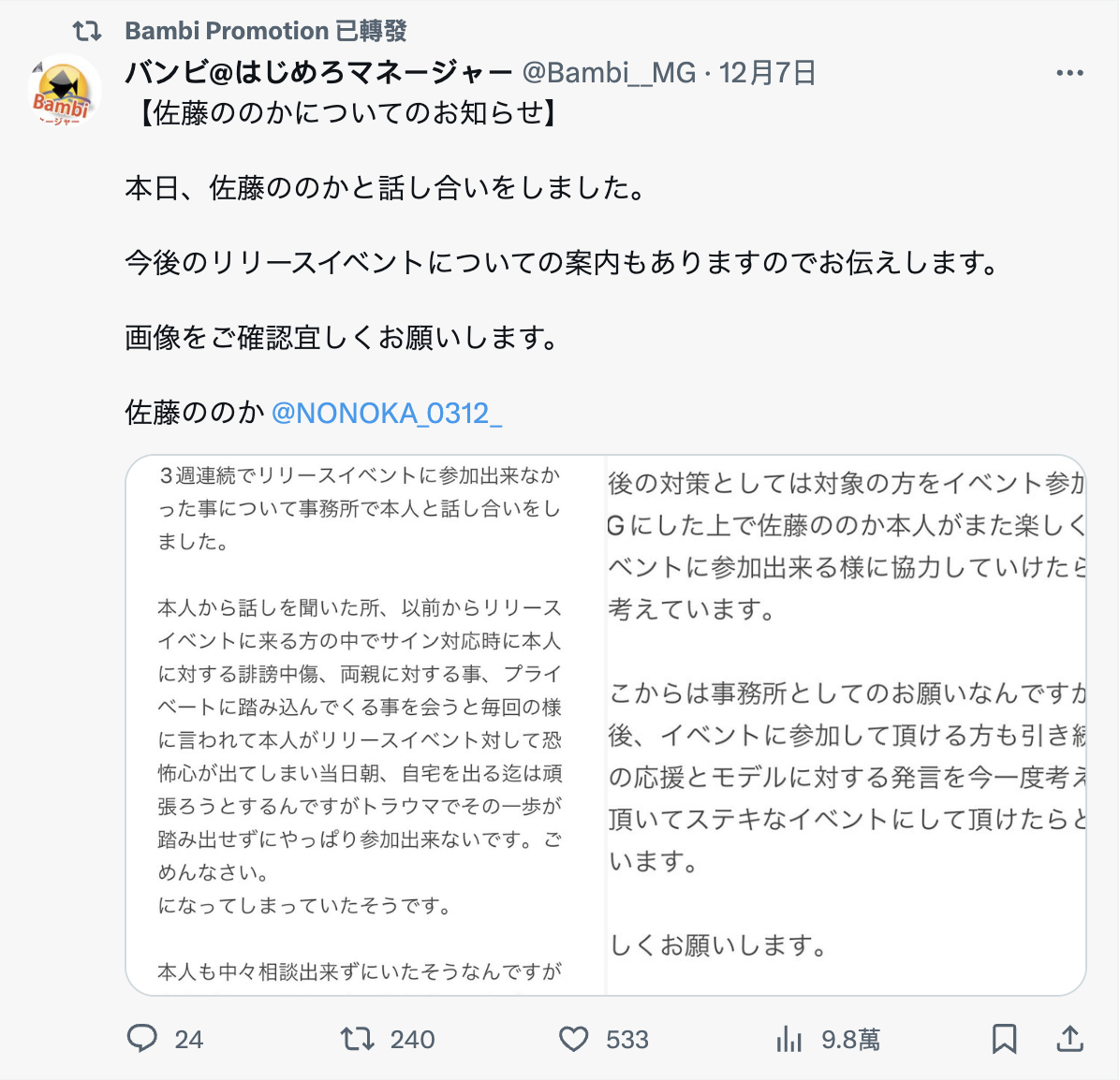 所以佐藤及其经纪公司都有针对此事说明,佐藤是说该名粉丝没有自报姓名,再加上不想把粉丝当坏人,所以没有向公司报告此事;而事务所也公开谢罪说没有注意到佐藤ののか(佐藤乃乃果)的状况,现在已经禁止那位粉丝参加活动,也保证佐藤ののか(佐藤乃乃果)接下来会「愉快地参加活动」: