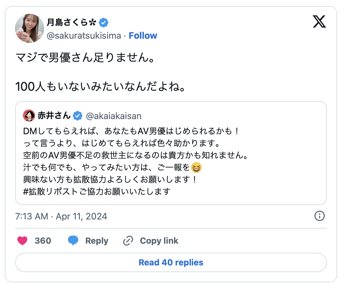 业界反新法的代表人物,也是AV女优的月岛さくら(月岛樱)证实了赤井さん的说法,她说目前业界的男优应该不足100人吧,对比女优如雨后春笋般地出道真的是敌众我寡棒子不够用,状况不太妙⋯